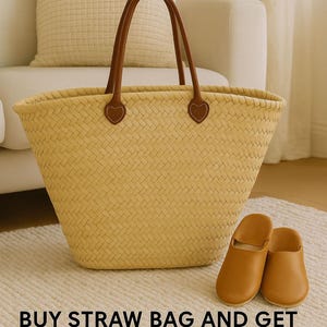 Handwoven Moroccan Straw Tote Bag with Free Slippers: Boho Beach Bag
